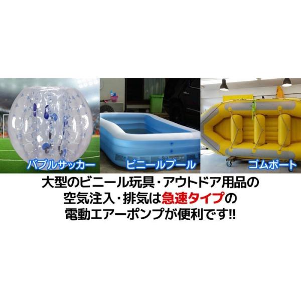 ビニール玩具やアウトドア用品急速で膨らませるだけでなく、空気注入と同じ要領で空気を排気する事もできる一台2役の電動ポンプです。