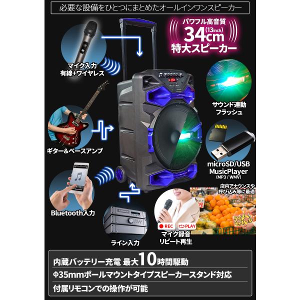 こんなカッコいい充電式のスピーカーを見た事ありますか?! キャリーカートで移動も楽々! 音響に必要な設備を一台に集約! 直径34cmの大型スピーカーを搭載!