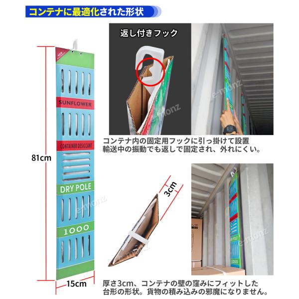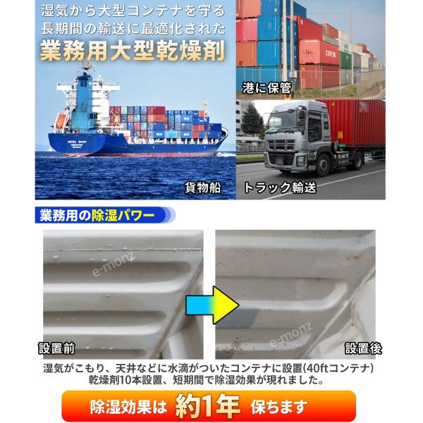 貨物船による数カ月に及ぶ輸送にも対応できるよう、約1年という長期間の除湿効果持続を可能にしました。 さらに乾燥剤を複数設置する事で除湿効果がさらに高まります。