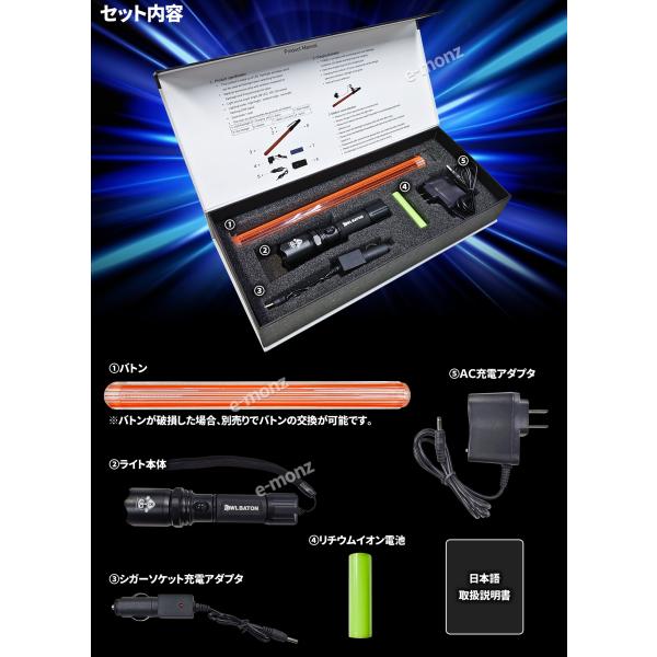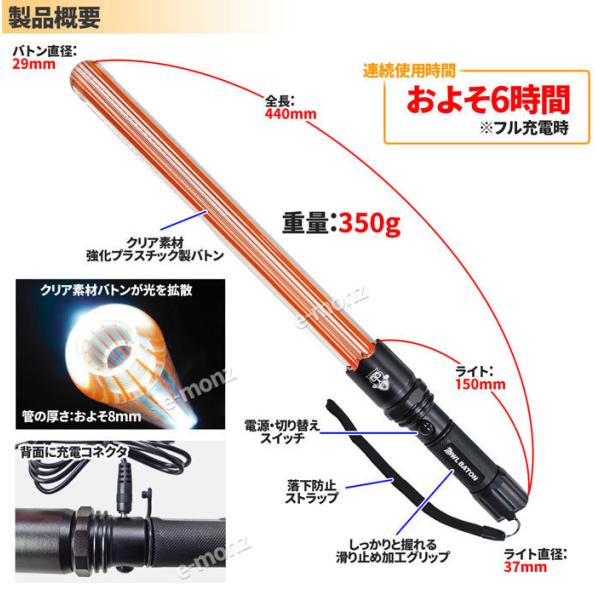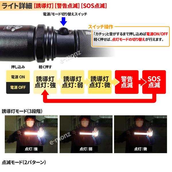 高輝度 高耐水 高耐衝撃性 アルミニウム合金 ポリカネート バッテリー リチウムイオン電池 警告 発光 点灯 点滅 フラッシュライト ハンディライト マルチライト LED誘導灯 LED誘導棒 警備用品 防災用品 警備員 警告灯 交通指揮棒 交通整理 ガードマン パトロールライト 工事現場 夜間警備 消防 防犯 防災 災害 事故 合図灯 保安灯 停止棒 駐車場