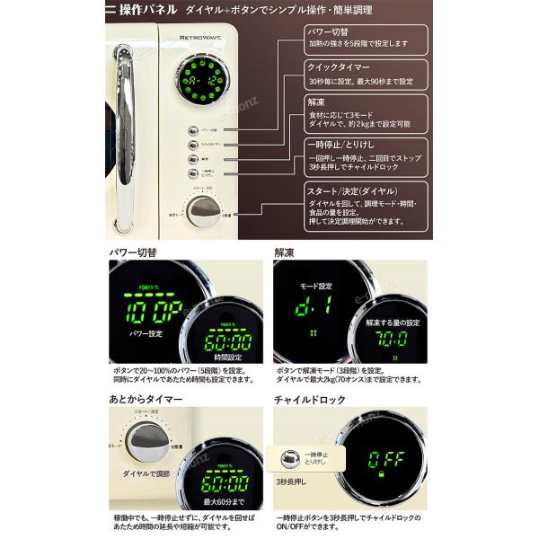 ●おしゃれでレトロ調なデザインに拘りました!すぐに1分温めたい時はダイヤルを一度押すだけの簡単操作。温めながら時間変更可能な後からタイマーが便利。もちろん解凍や料理別に12種の加熱モードも!