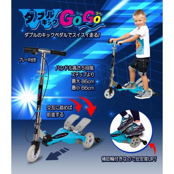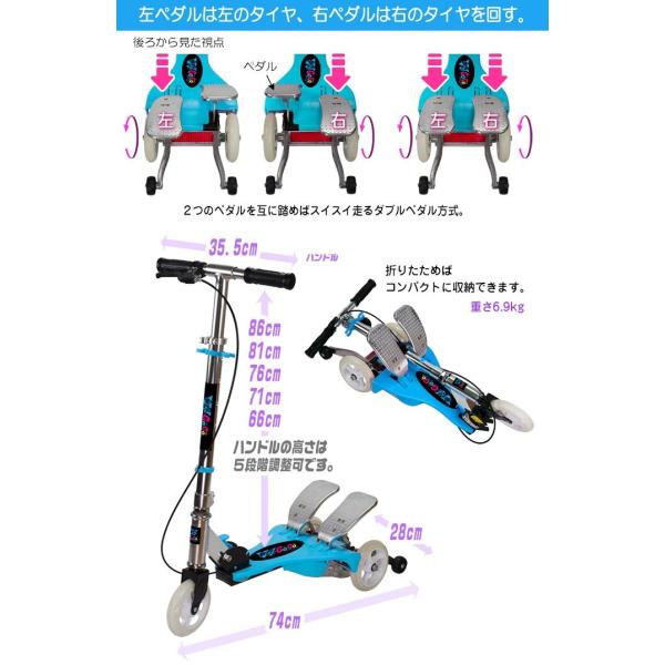 ダブルペダル キックボード 3輪 ブルー 折り畳み式 軽量 ハンドブレーキ ベル付 イルミネーションタイヤ 【 ダブルキックGoGo ブルー 】 キックスクーター