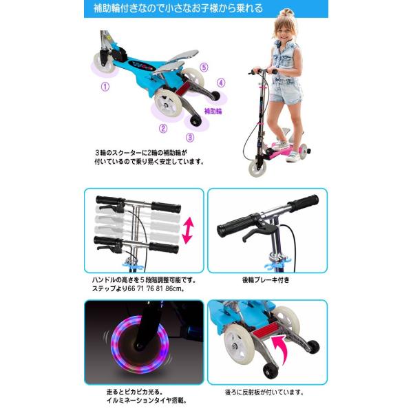 両足でペダルをふみふみ!まるで人力のセグウェイみたいな楽しい乗り心地でグングン走るんです!補助輪がついて小さなお子様でも安定した走行が可能です。3才頃〜小学校高学年まで長く遊べる楽しいスクーターです。