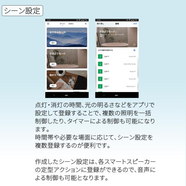 一般的な電球ソケット(E26口金)に調光可能なスマート照明が導入できます。天井灯や間接照明、スタンドライトやデスクライトといった照明器具に取り付け可能。調光はスマホアプリとスマートスピーカーで行うので、業者による施工が必要な調光スイッチの取り付けは不要です。