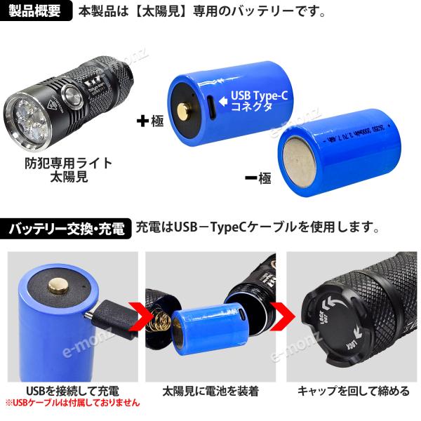 防犯専用ライト太陽見 【 交換用バッテリー 】 USB type-C フラッシュライト 充電式 LED リチウムイオン電池 電池 USB ハイパワー 小型 防犯 防災 停電 緊急用