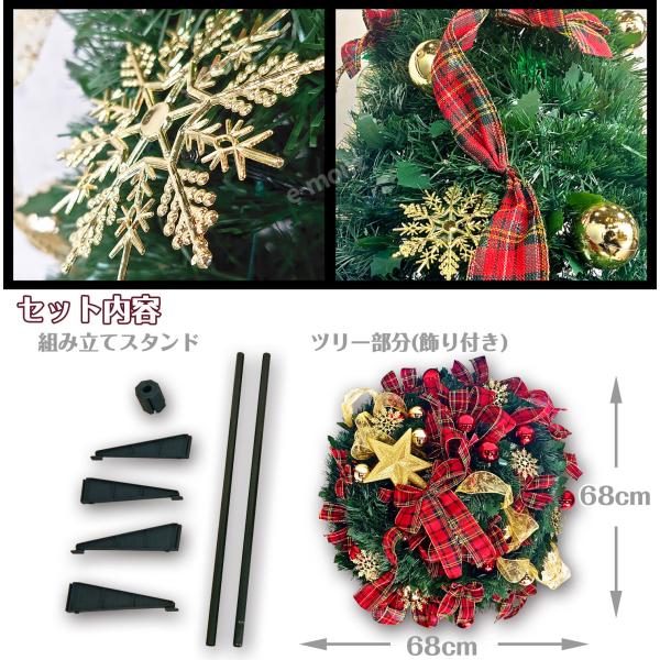 ツリー部分のすべてがネット状に編み込まれ、豪華なオーナメントも全てツリーに装飾済みです。設置は、組み立てたポールの上からかぶせるだけで完了します。