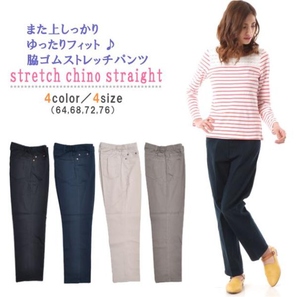パンツ 脇ゴム ストレート ストレッチ レディース カラーパンツ チノパン 綿パン カラーデニム ブラック ベージュ カーキ 64 68 72 76