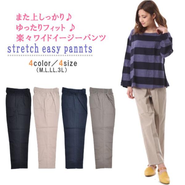 パンツ イージーパンツ ワイドパンツ ストレッチ レディース ウエスト総ゴム カラーパンツ チノパン 綿パン ブラック ベージュ カーキ M L LL 3L