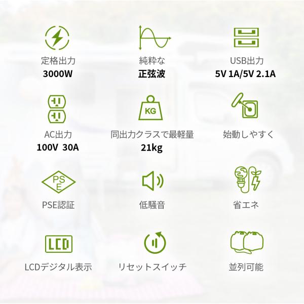【高出力・軽量】3.0kVAの高出力ながら、わずか21kgの軽量設計。
