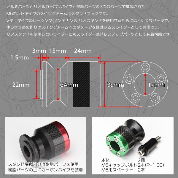 バイク スタンドフック スライダー兼用 スイングアーム用 M6 リア用 アルミ&カーボン&樹脂 左右セット S-524