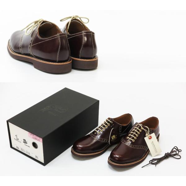 日本が誇る老舗シューズメーカー、リーガルと共同開発したクラシカルな雰囲気のサドルシューズ。リーガルの既存ラインナップのモデルをベースにカラーリングやパターンのデザインをグラッドハンドのオリジナルに変更。サドルシューズは船員の靴から取り入れられたといわれるデザイン。つま先はプレーンで、アッパーの中程に馬の鞍(サドル)を置いたような革の切り替えがあるのが特徴。甲革を柔らかく、つま先裏、ベロ裏、履き口周りにスポンジを搭載し、カップインソールにすることでフィッティング性を考慮、アウトソールも軽量タイプを採用しクッション性、屈曲性が向上しています。インソールにはダブルネームの箔押しが入っています。製法はグッドイヤーウェルトで、ソールの張り替えも可能。替え紐と専用のボックスが付属します。日本製。