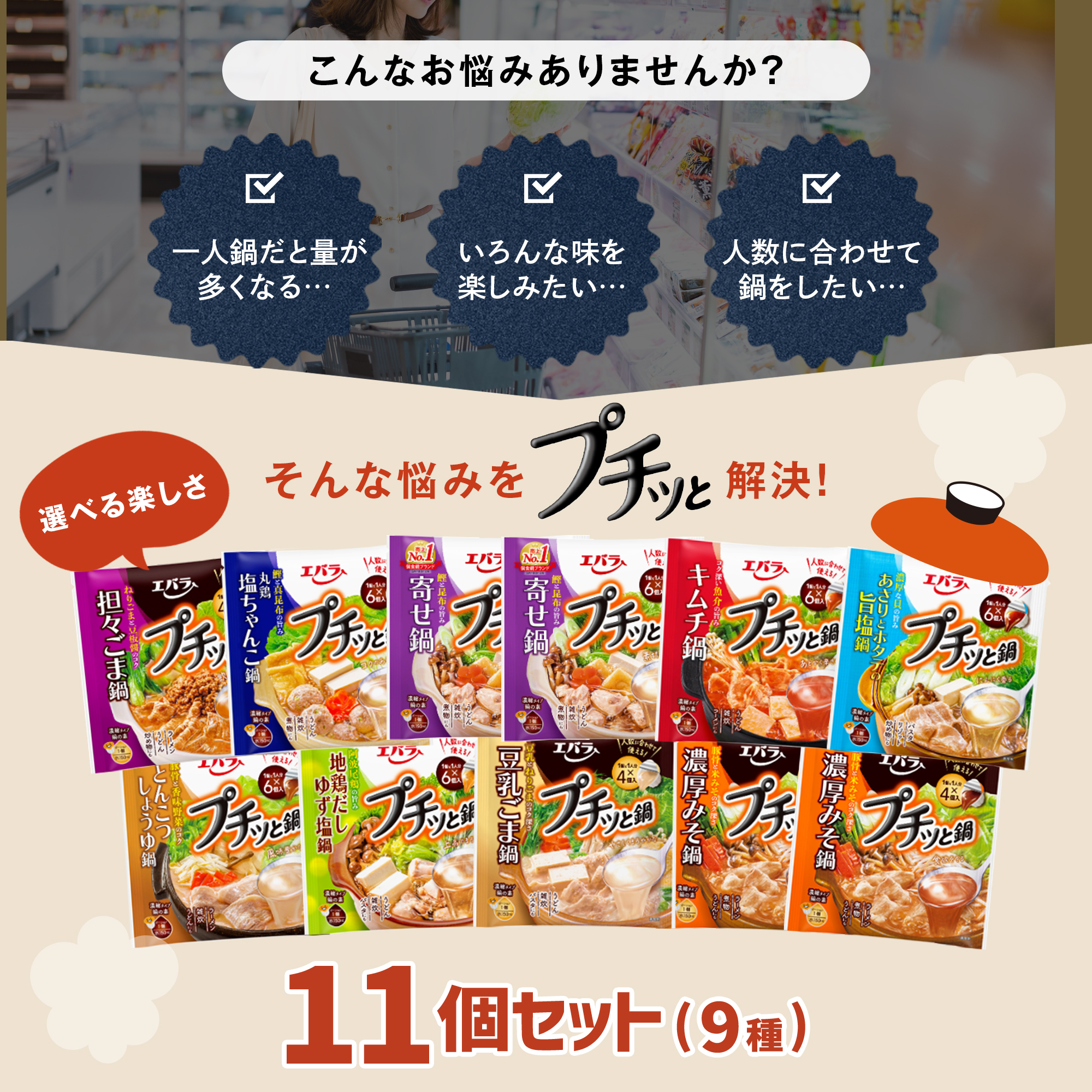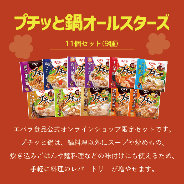 人気のプチッと鍋が全9種11個のセットになって、お買い得価格!エバラ食品公式オンラインショップ限定セットです。
