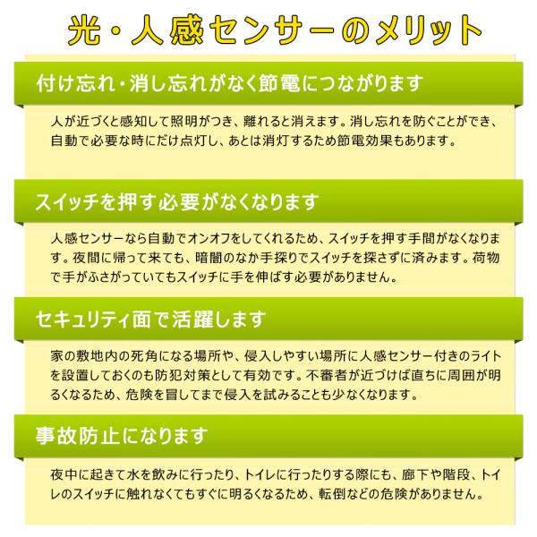 ● 光・人感センサー機能付き、自動で点灯・消灯を実現できます。明るい場所では人が近づいても点灯しない、暗くなれば、自動的点灯するようになる仕様です、節電しながら便利になります。