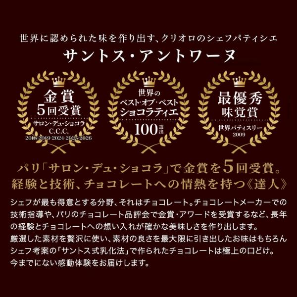 乾燥クレープとライスクリスピー、そして砕いた香ばしいアーモンドを、サントスシェフが厳選したヴァローナ社の高級チョコレートでコーティングしました。