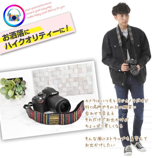 マルチカラーのエスニック民族調カメラストラップです。マルチカラーですので、様々なファッションにぴったりです。