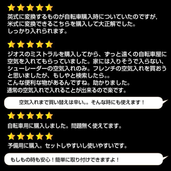 仏式バルブを米式バルブに変換するアダプターです。米式バルブは自動車に広く使われているバルブの種類です(一部のマウンテンバイクなども米式バルブが多い)。その為、自動車の空気入れを使用できます。ガソリンスタンドなどで、空気入れを借りて空気を入れる事ができるようになるため、ツーリング時には一つもっておくと便利です。