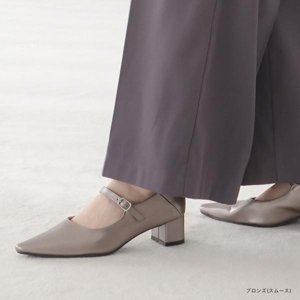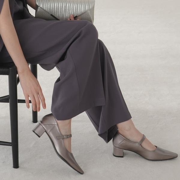細ストラップが華奢見えな、つま先が尖ったメリージェーン太めのデザインヒールで安定感抜群。踵を踏める柔らかい素材を採用し、靴ズレしにくい。