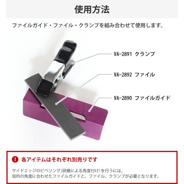※サイドエッジビベリングには、お好みの角度に合わせたファイルガイドと、ファイル(ヤスリ)、クランプが必要です。