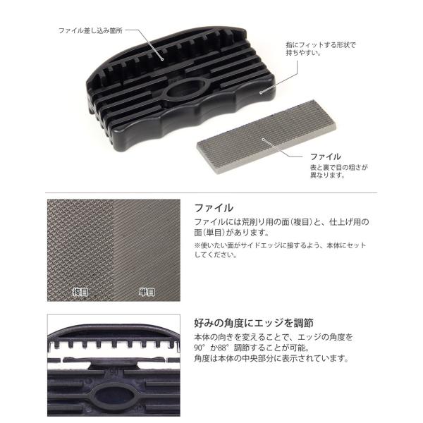 サイドエッジを90°または、88°の角度にファイリングする事ができるエッジシャープナー。