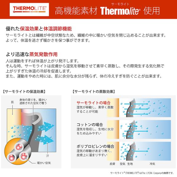 また 保温効果 体温調節機能 蒸気発散作用 に優れた 高機能素材 サーモライト 素材で、ハードな スキー スノーボード 中でも快適なつけ心地を実現。