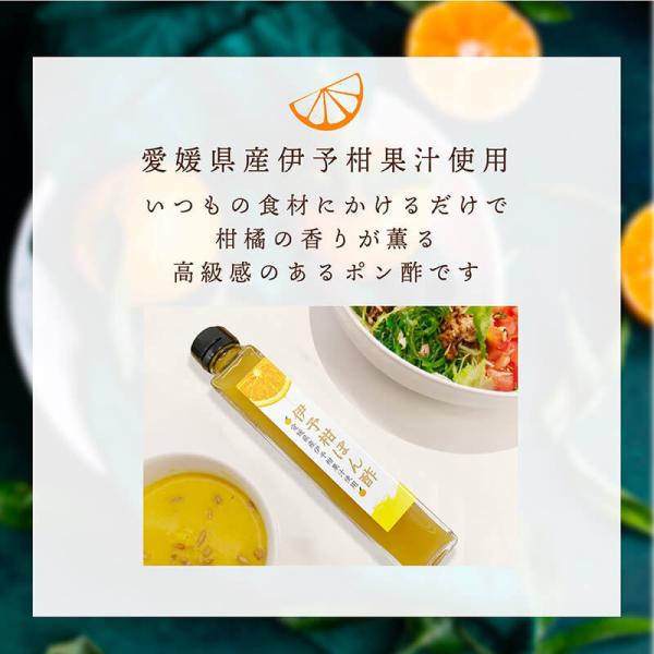 愛媛県産の伊予柑の果汁を使用した伊予柑ぽん酢です。愛媛県産柑橘代表の甘酸っぱい伊予柑の果汁を使って作りました。焼き魚や焼肉、生野菜(サラダ)や鍋物など幅広くご利用いただけます。使用前によく振ってからお召し上がりください。