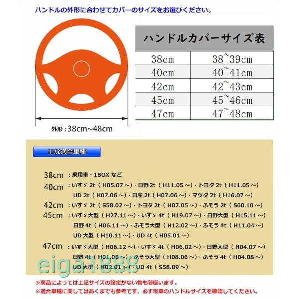 【サイズ】長距離トラックドライバー、大型トラックドライバーに人気のハンドルカバー。形状?円形(通常丸型)。適合するハンドル直径は38〜48cmの6種類となっております、厚さ4.6mm。ハンドル外径をご確認の上ご購入下さい。※サイズ?形状が一致しております場合でも、ハンドルが細い車種には装着できかねますので、ご注意下さい。