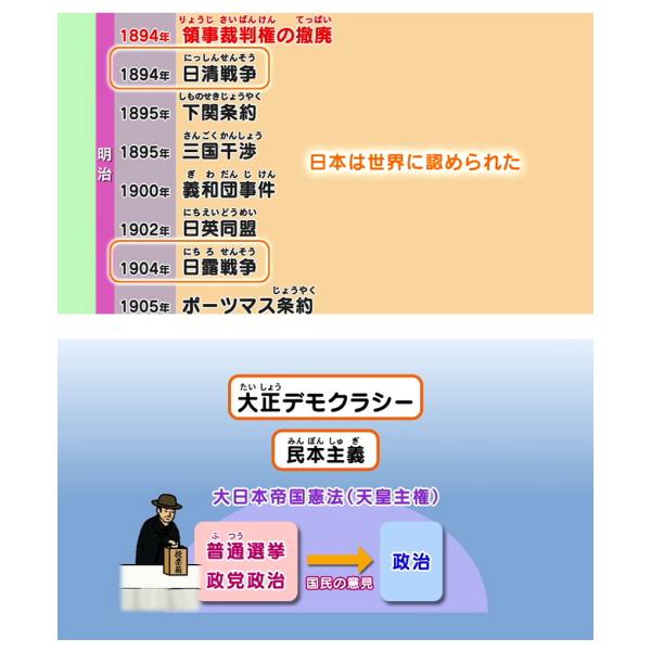 中学受験で出題の多いパートでもある重要な日本の歴史です。学校の授業にも大いに役立つ内容です。江戸時代末期のペリー来航から大正時代の第一次世界大戦、普通選挙法制定までをまとめました。