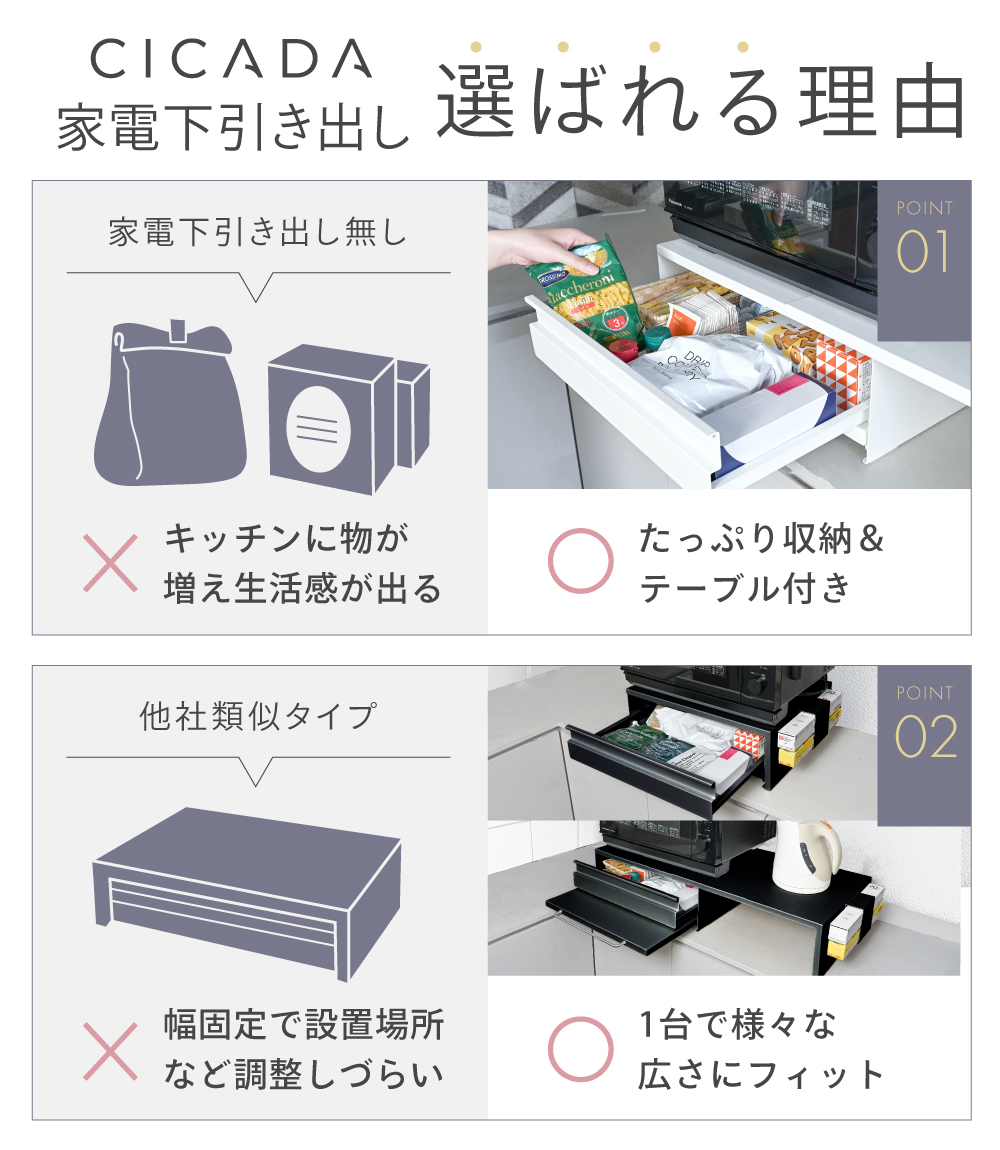 家電下引き出し 家電下スライドテーブル 伸縮 キッチン 家電下収納 家電下 引き出し スライドテーブル キッチンラック 収納ラック レンジ台 CICADA