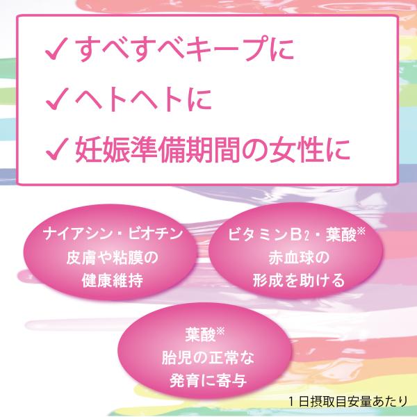 【栄養成分表示[2粒460mgあたり]】熱量1.8kcal、たんぱく質0.17g、脂質0.01g、炭水化物0.26g、食塩相当量0.0003g、ビタミンB1 40.0mg、ビタミンB2 30.0mg、ビタミンB6 30.0mg、ビタミンB12 20.0μg(833)、ナイアシン40mg(308)、パントテン酸40.0mg、ビオチン50μg(100)、葉酸200μg(83)