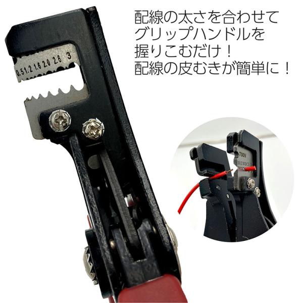 配線の太さを合わせてグリップハンドルを握りこむだけ!配線の皮むきが簡単に!