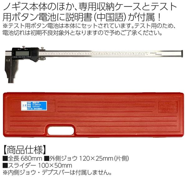 ノギス本体のほか、専用収納ケースとテスト用ボタン電池に説明書(中国語)が付属!