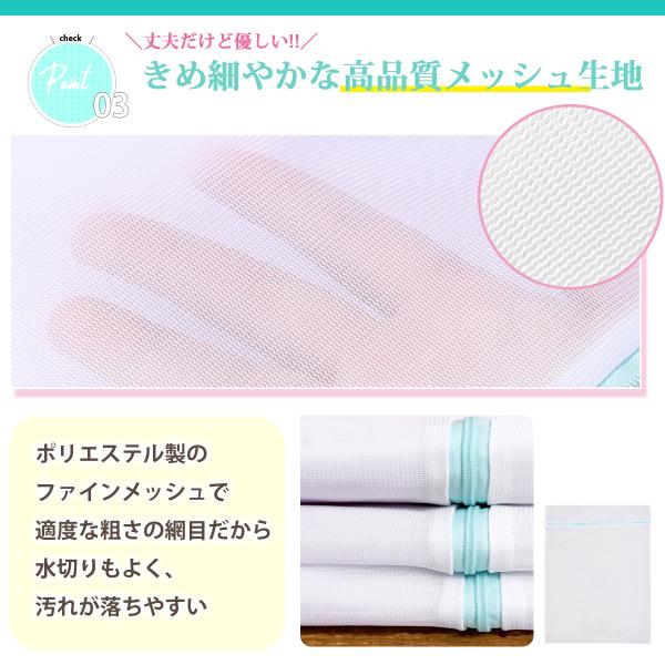 100%ポリエステル製のファインメッシュ構造で、洗濯物の絡みや型崩れなど防ぎ、色落ちや色移りも防止