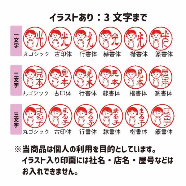 原画をもとに消しゴムはんこで作った、あたたかみのあるちびまる子ちゃんのイラストが魅力の印鑑セットです。印鑑本体はもちろん、印面や朱肉にもイラストをあしらい、使うたびにほっこりするデザインに仕上げました。印面はイラスト入り/イラストなしから選択可能。文字は丸ゴシック・古印体・行書体・隷書体・楷書体・篆書体の6書体からお選びいただけます。朱肉は使いやすい速乾タイプ。印袋とオリジナル紙箱付きで、ご自宅用はもちろん、ちょっとしたギフトにもおすすめです。セット内容・15mm印鑑(柘植材)・朱肉(速乾タイプ/直径43mm)・印袋(ピンク)・オリジナル紙箱印面について・イラストあり:文字数 3文字まで・イラストなし:文字数 4文字まで※当商品は個人利用を目的とした商品です。 イラスト入り印面には、社名・店名・屋号などはお入れできません。