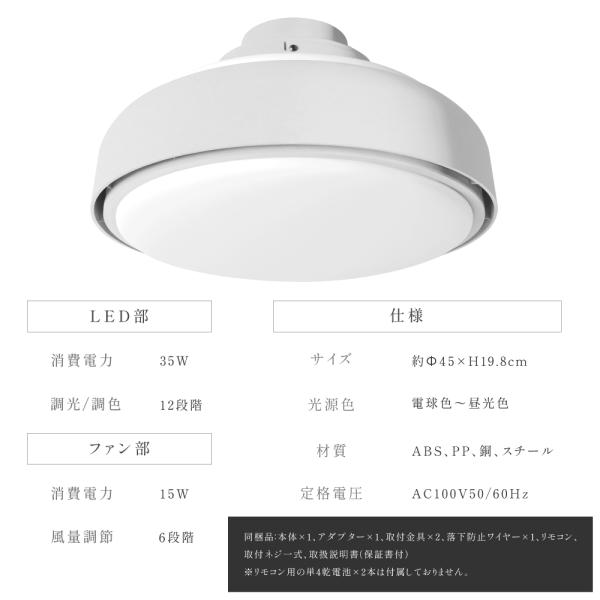 【製品仕様】商品サイズ:約Φ45xH19.8cm / カラー:ホワイト /適用畳数:8~12畳 / 風量調整:6段階 / 調光・調色:12段階 / 消費電力:35W / 材質:ABS+PP+銅+鉄