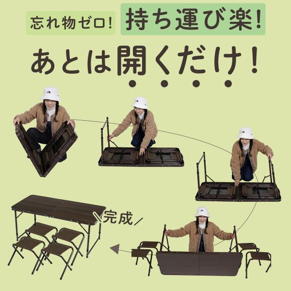 これ1台で準備完了。120×60cmの折りたたみテーブルにチェア4脚をセット。全て中に収納でき、持ち運びもラクラク。木目調天板が映えるアウトドア必携アイテム。
