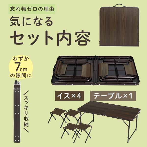 ・キャンプやBBQに最適な120×60cmの広々テーブル。・テーブル1台+チェア4脚のオールインワンセット。・脚を広げるだけの簡単設営、シンプル構造で楽々セッティング。・全て中に収納でき、持ち運びもストレスフリー。・シーンに合わせて使える、51.5cm、70cmの高さ2段階調整。・指紋や汚れが付きにくく、落としやすいメラミン加工耐熱・耐水天板。・おしゃれな木目調デザイン天板。・室内でも安心床保護キャップ付き。