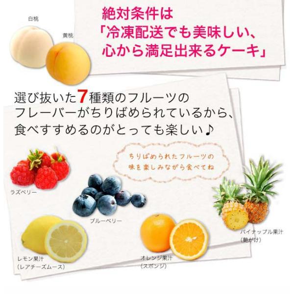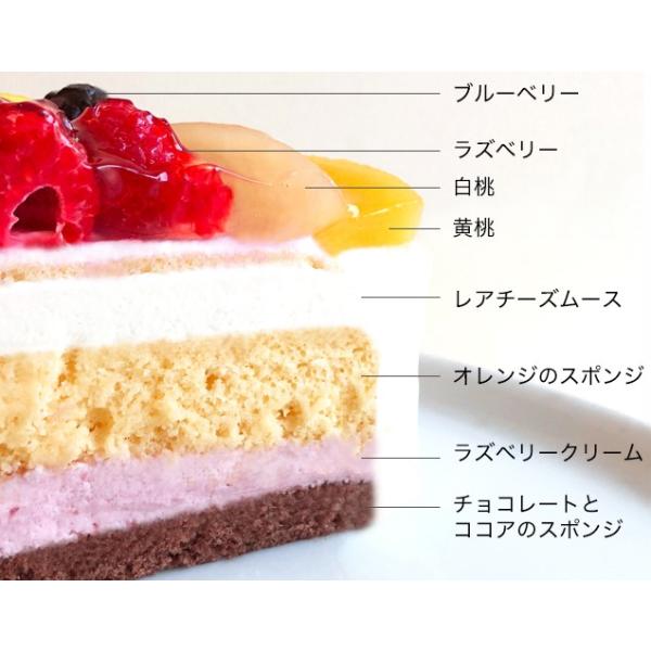 選び抜いた7種類のフルーツエッセンスが所々にちりばめられています。レアチーズムースとフルーツエッセンスの味わいを楽しみながら食べすすめて欲しい、という想いが込められています。口に入れた瞬間の全体の口どけ、飽きのこない味わいをぜひお楽しみ下さい。誕生日 結婚記念日 のお祝い等、大人もお子様も一緒にお楽しみいただけます!