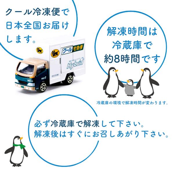 冷凍にてお届けいたします。そのまま冷凍庫で保存し、お召し上がりの約8時間程前に冷蔵解凍して下さい。解凍後は要冷蔵。