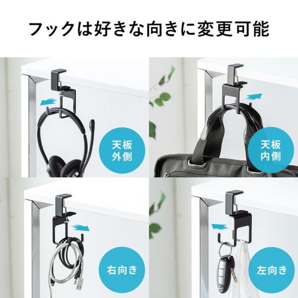 デスクや棚に挟み込んで取り付け可能なクランプ式のフックです。
