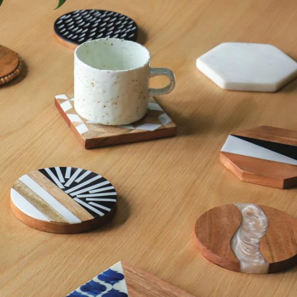 木材や大理石、レジンなどの異素材の組み合わせが特徴のコースターです。