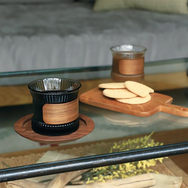 ガラスは耐熱性で、ウォルナット材のスリーブがデザイン性と機能性を出してくれています。
