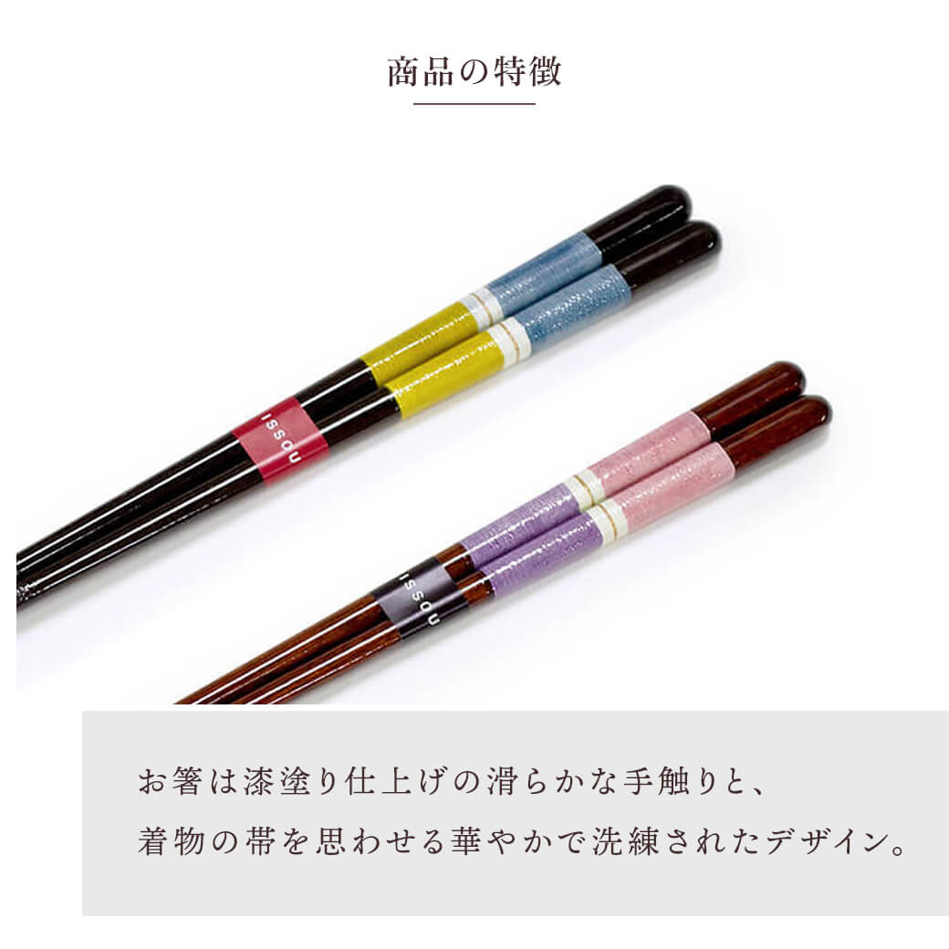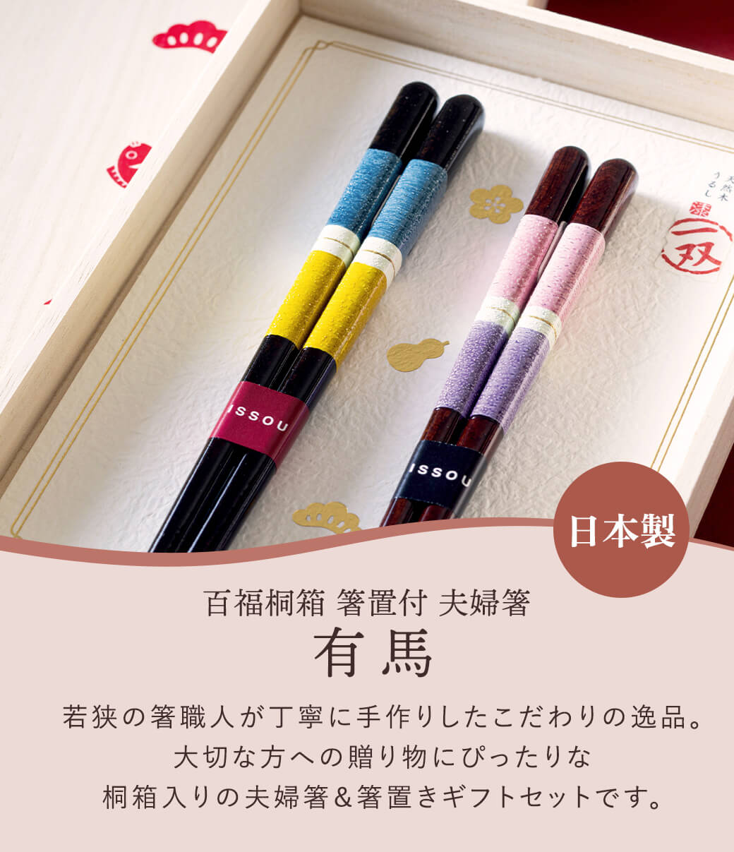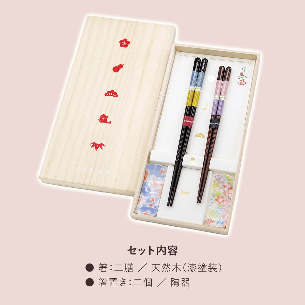 桐箱入りの夫婦箸&箸置きギフトセット。お箸は若狭の箸職人が手作り。漆塗り仕上げの滑らかな手触りが特長。