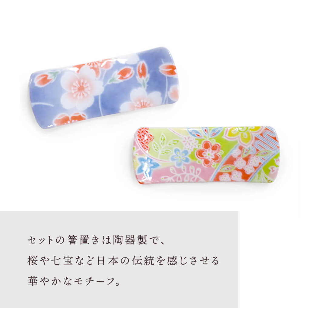 箸置きは陶器製で、桜や七宝など日本伝統のモチーフ。