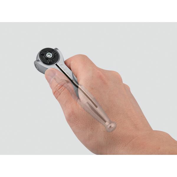 ヘッド部を持って小指がかかる長さ、手の中に収まる長さのショートスイベルラチェットハンドル。
