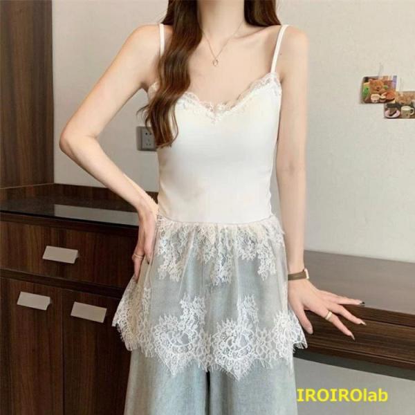 ノースリーブ キャミソール キャミソール レース トップス レディース タンクトップ ロング 付け裾 インナー レイヤード レース切り替え 裾フ