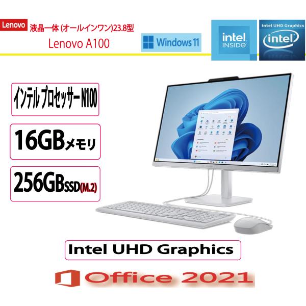 新品 Lenovo(レノボ) デスクトップパソコン Lenovo A100 インテル N100・16GBメモリー・256GB SSD・23.8型フルHD液晶搭載 オフィス付き