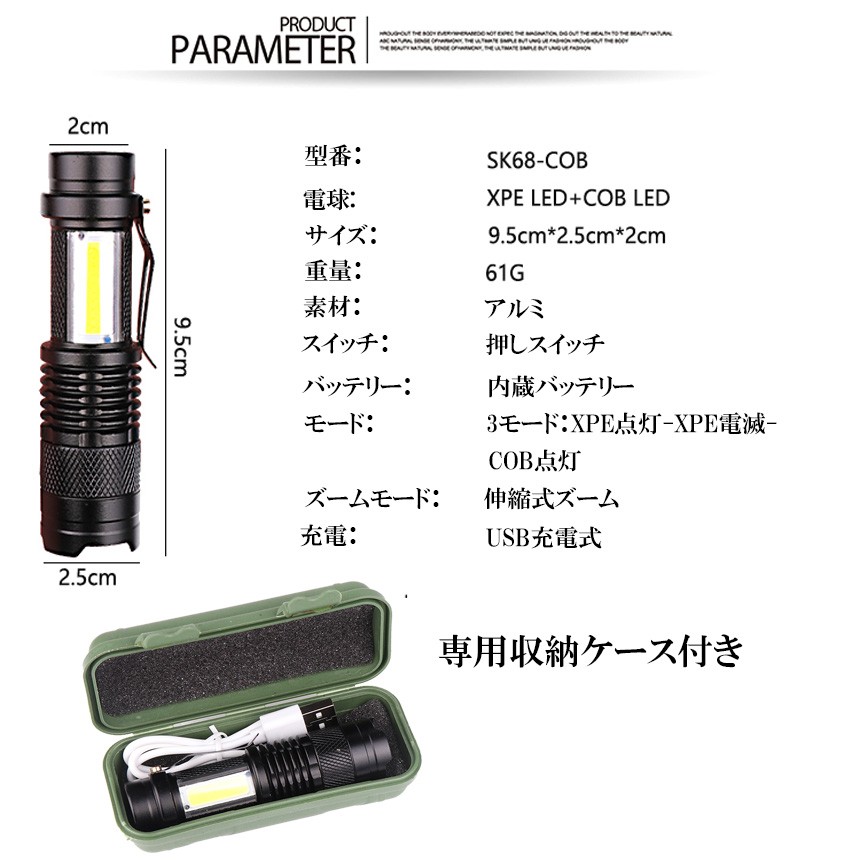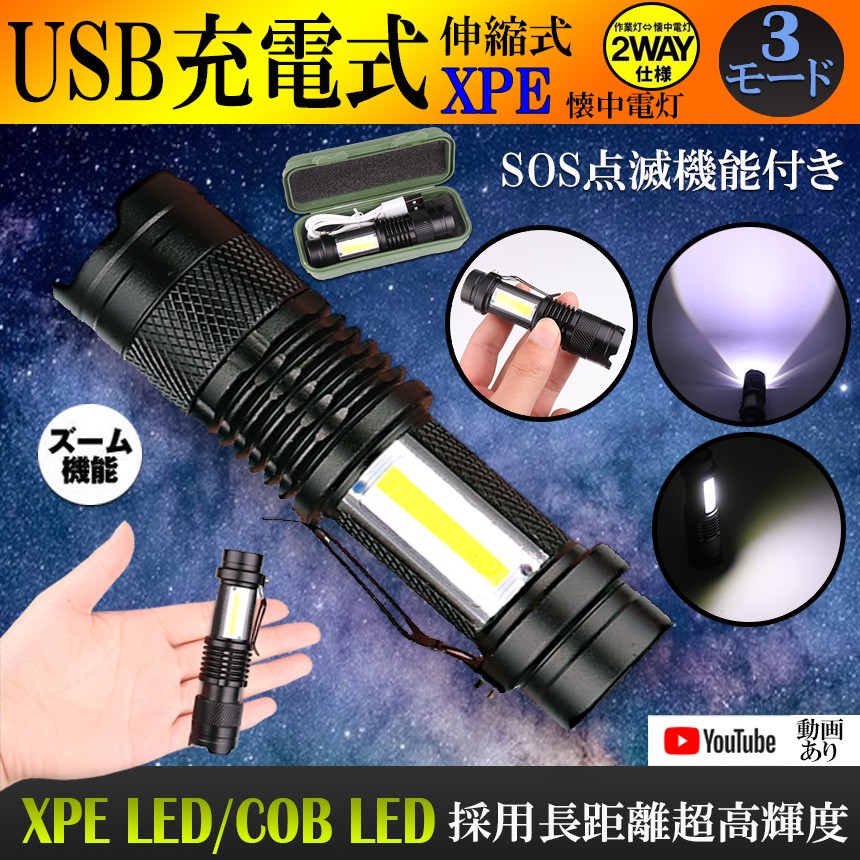 懐中電灯 USB 充電式 作業灯 XPE+COB LED 強力 超小型 防災 点滅 停電灯 高輝度 ハンディライト 伸縮ズーム フラッシュライト 夜間 明るい SK68USB