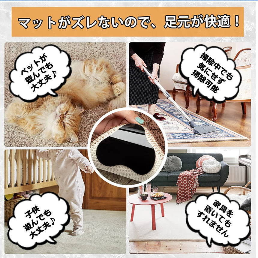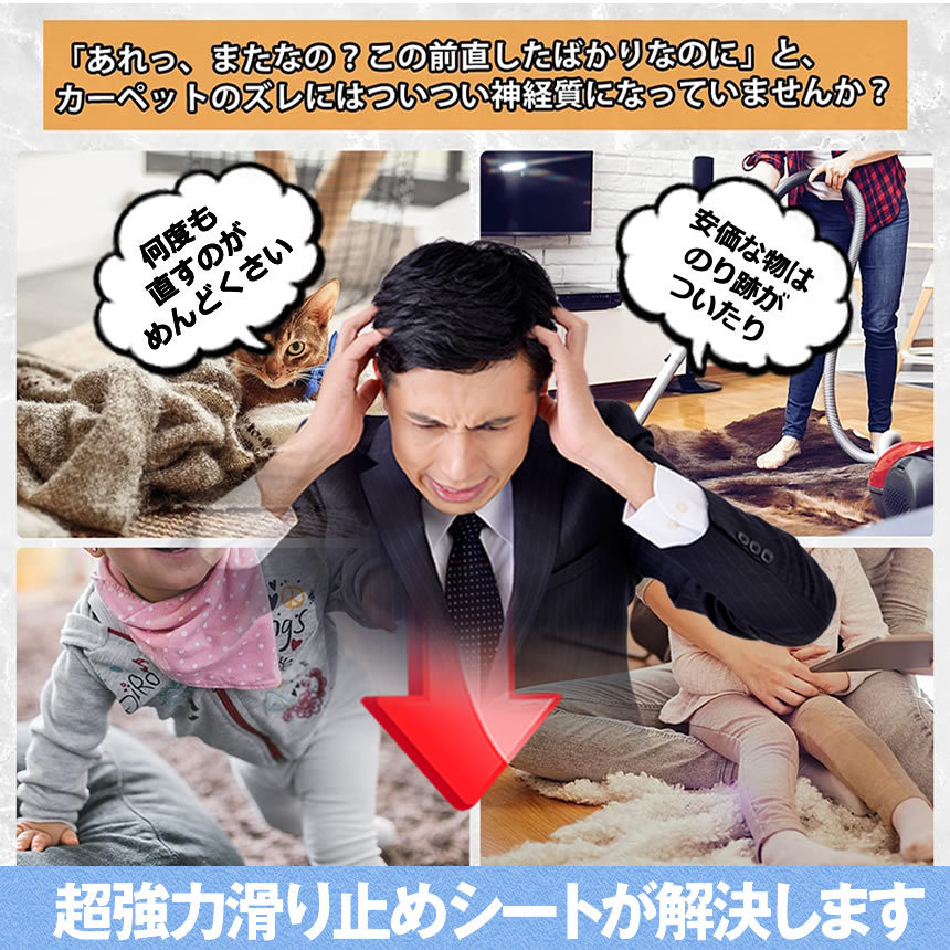 床にもしっかり粘着するので、カーペットがずれにくくなります。