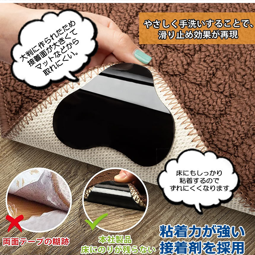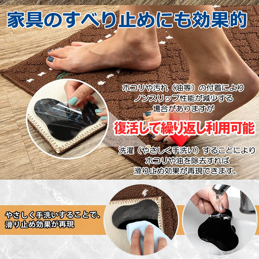 滑り止めマットの床との接着面にはのりが残らない3RGEL接着剤が施され、フローリングにのりを残しません。ホコリや汚れ(油等)の付着によりノンスリップ性能が減少する場合がありますが、洗濯(やさしく手洗い)することにより、ホコリや油を除去すれば滑り止め効果が再現できます。
