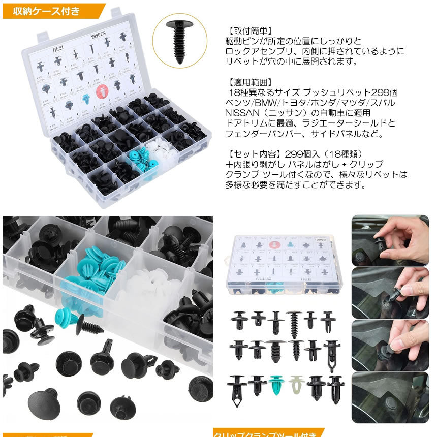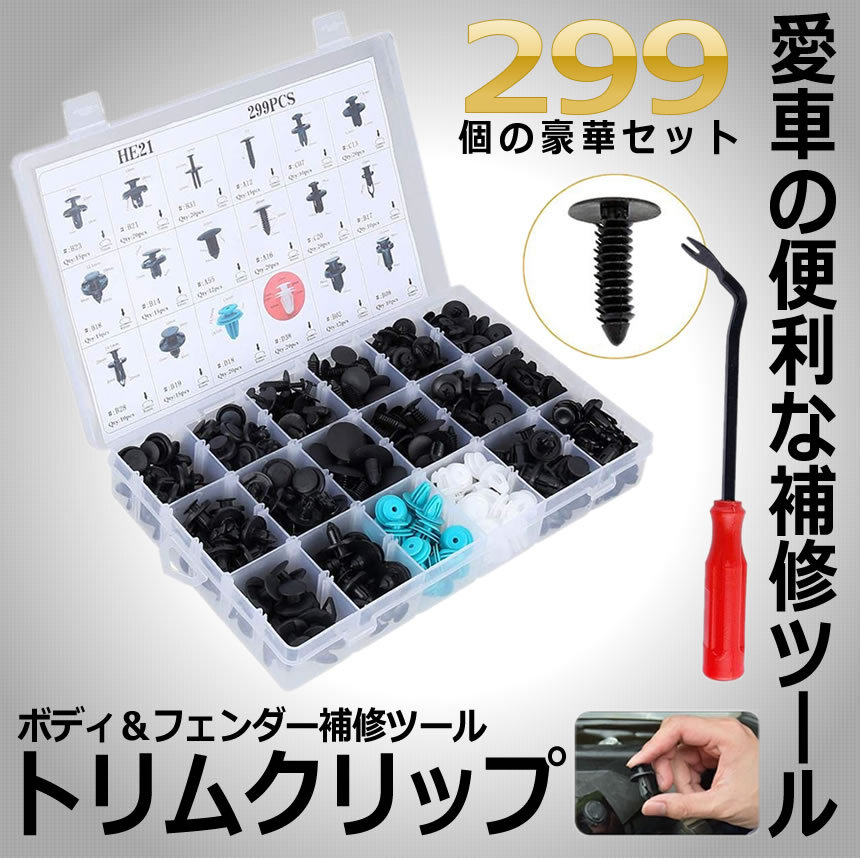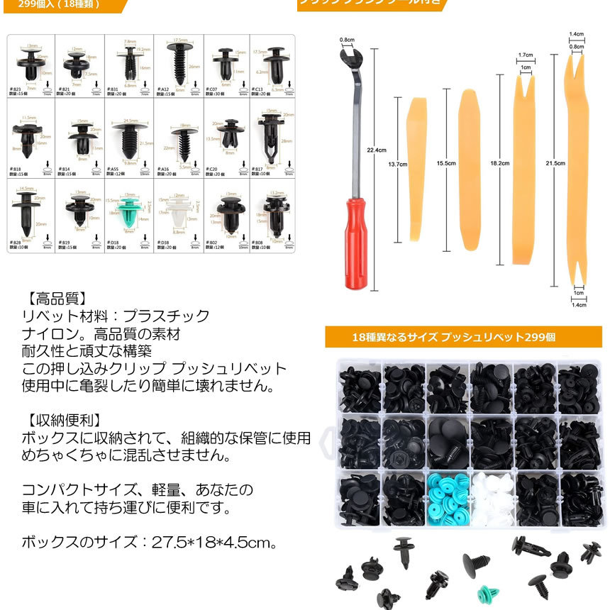 トリムクリップ カー用品 外装グッズ 299個 18種類 バンパー プッシュ型 リベット 自動車フェンダー 補修ツール バンパー 押し込み式 PUSHUTORI